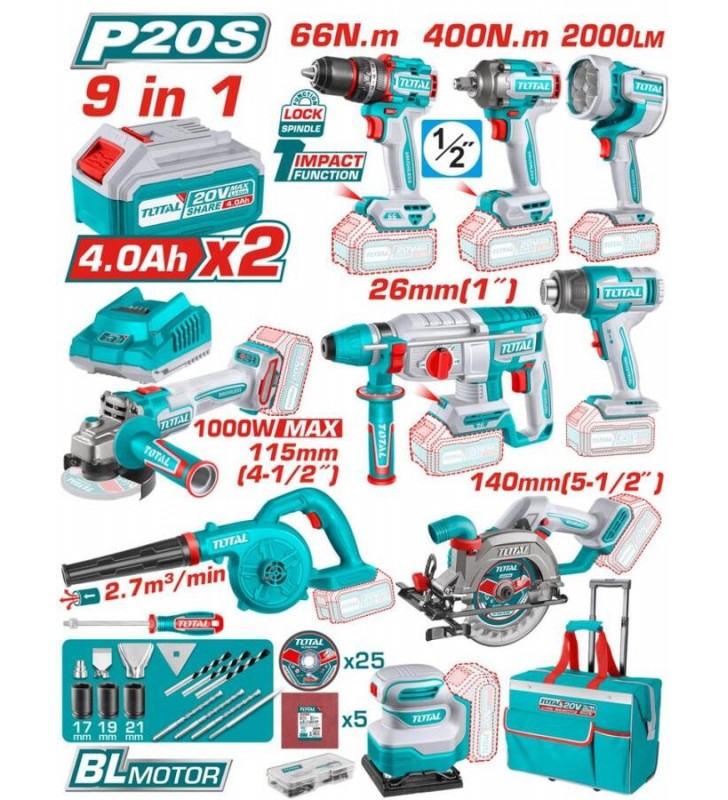 TOTAL ΕΠΑΓΓ. ΣΕΤ 9τεμ ΕΡΓΑΛΕΙΩΝ ΜΠΑΤ. Li-ion 20V / 4Ah / 2 ΜΠΑΤΑΡΙΕΣ BL Motor (TOSLI250381E)