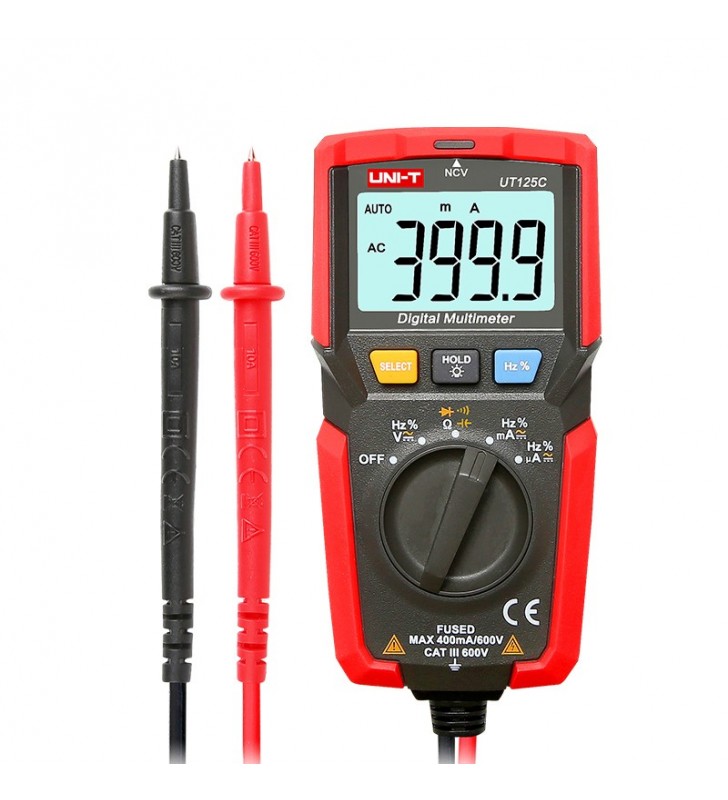 Το UT125C είναι ένα μέγεθος τσέπης, εργονομικό και αξιόπιστο πολύμετρο με 4000 μετρήσεις οθόνης. Είναι ένα χρήσιμο εργαλείο για ηλεκτρονικά DIY που εργάζονται με χαμηλά ρεύματα (<0,4Α). Αυτό το προϊόν είναι πιστοποιημένο CE/cETLus και συμμορφώνεται με το CAT III 600V.