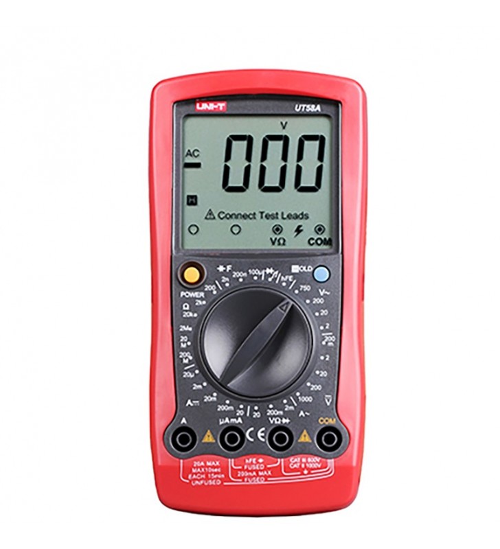 Η σειρά UT58 είναι ένα ασφαλές και αξιόπιστο ψηφιακό πολύμετρο που είναι εύκολο στη χρήση. Η μεγάλη οθόνη LCD 60mm x 54mm εμφανίζει άνετα αποτελέσματα μετρήσεων. Αυτό το ψηφιακό πολύμετρο ικανοποιεί μια ποικιλία εφαρμογών τόσο σε ηλεκτρονικά όσο και σε ηλεκτρικά πεδία.