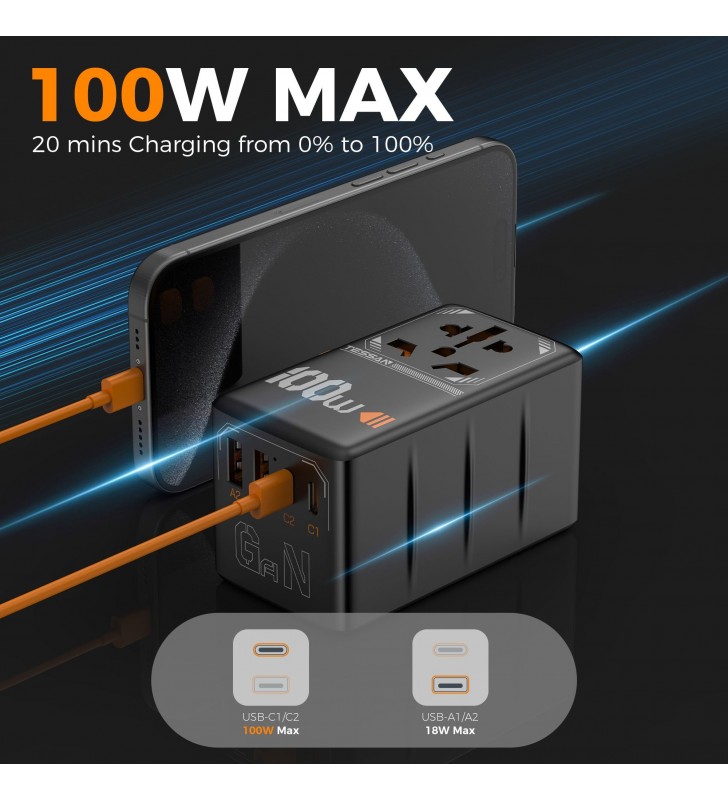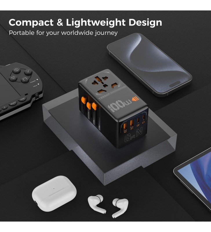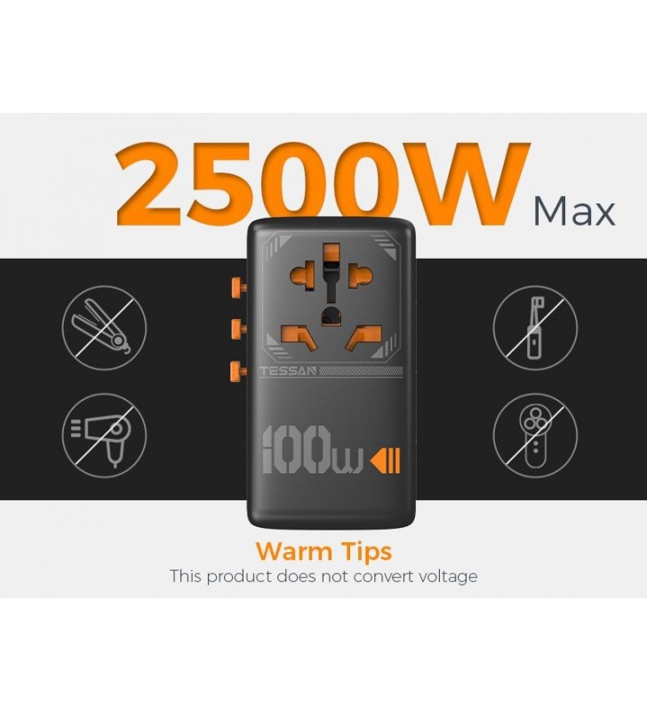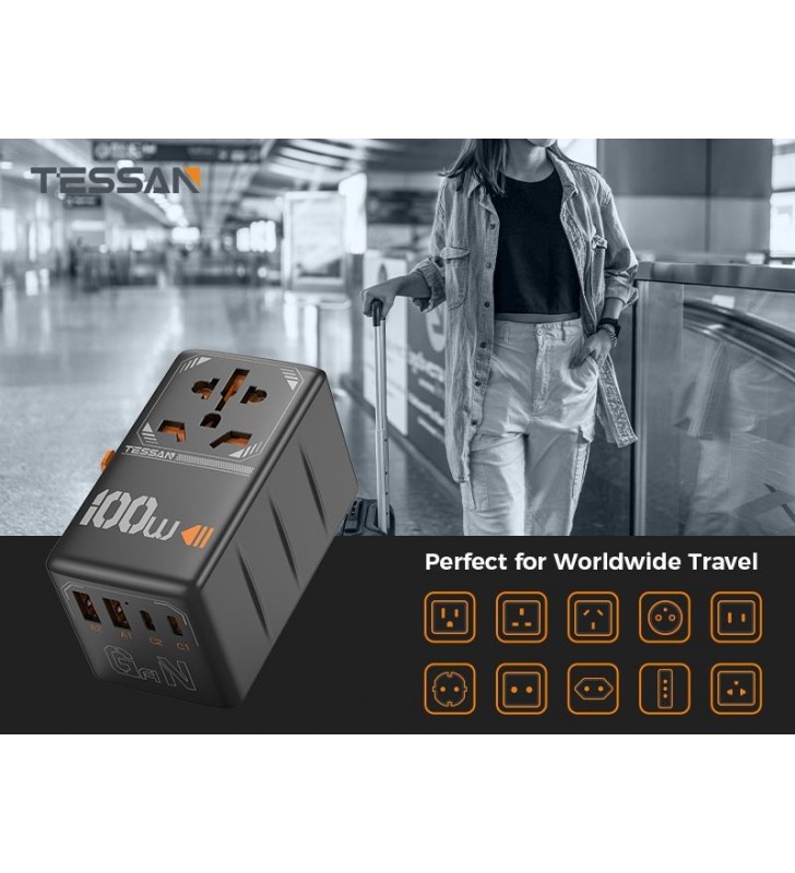 TESSAN GaN UNIVERSAL TRAVEL ADAPTER 2xUSB, 2xTYPE-C MAX 100W - TESSAN (TS-WTA04)
