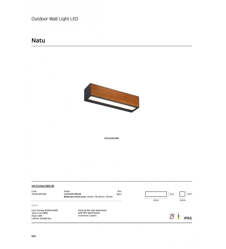 NATU Φωτιστικό τοίχου LED εξωτερικού χώρου, 220-240V, Ξύλο+ανθρακί. 3000K. 7W. 667lm. CRI>80. IP65, 25x6x6.5cm