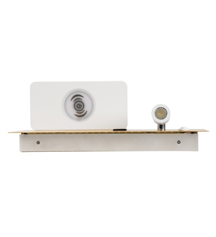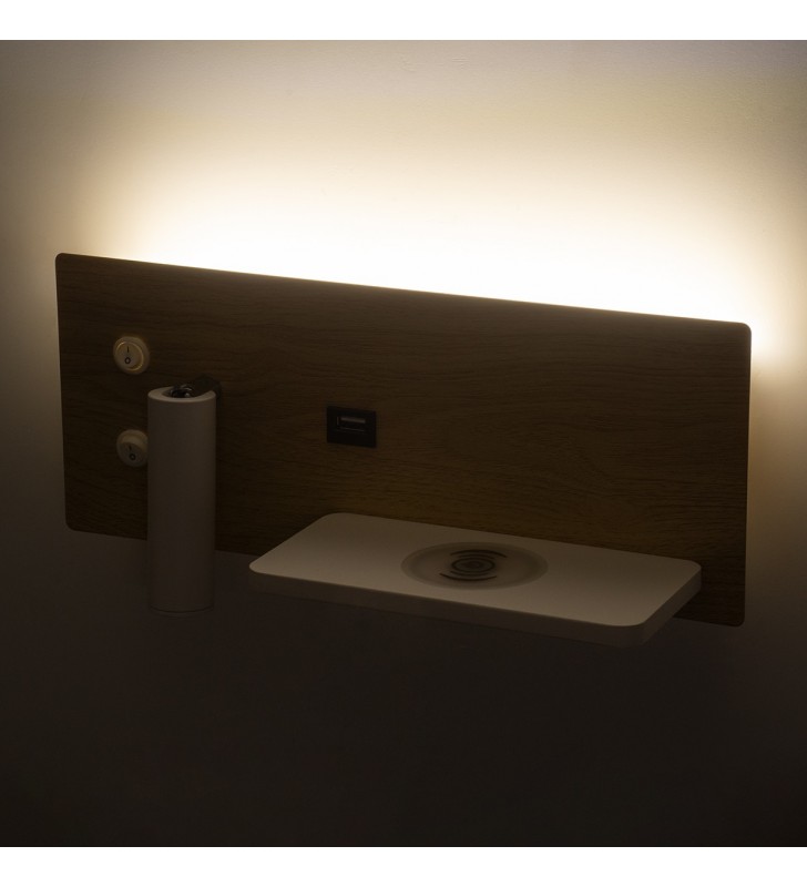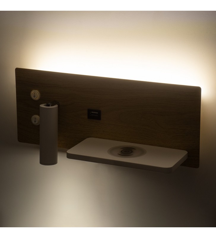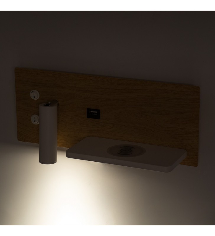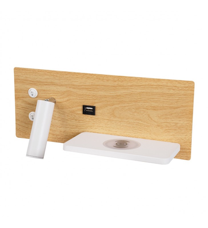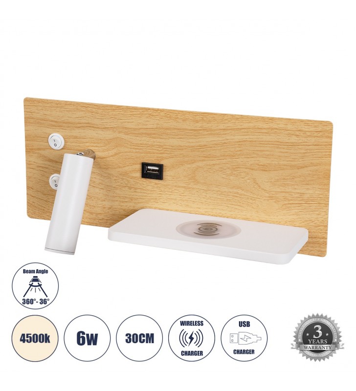 GloboStar® PALADIN 61360 Μοντέρνο Φωτιστικό Τοίχου - Απλίκα Ξενοδοχείου Bed Side LED 6W 720lm 36° AC 220-240V - Reading Light & Κρυφός Φωτισμός - Φορτιστές USB 3A & Wireless 20W - Μ30 x Π11 x Υ12cm - Φυσικό Λευκό 4500K - Ξύλο & Λευκό - Δεξί