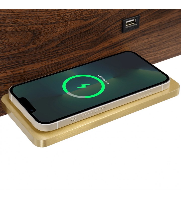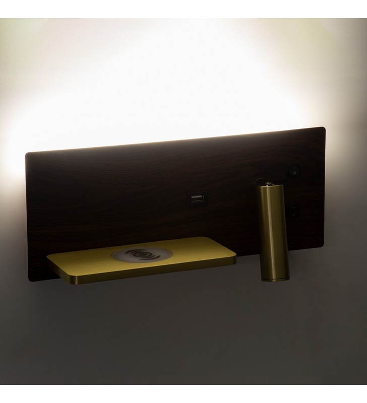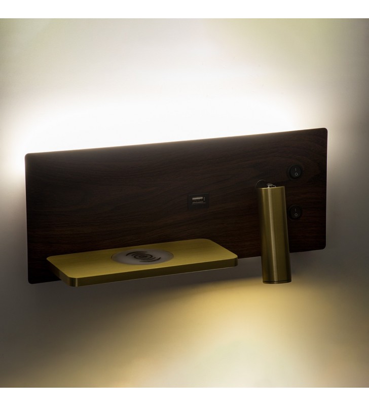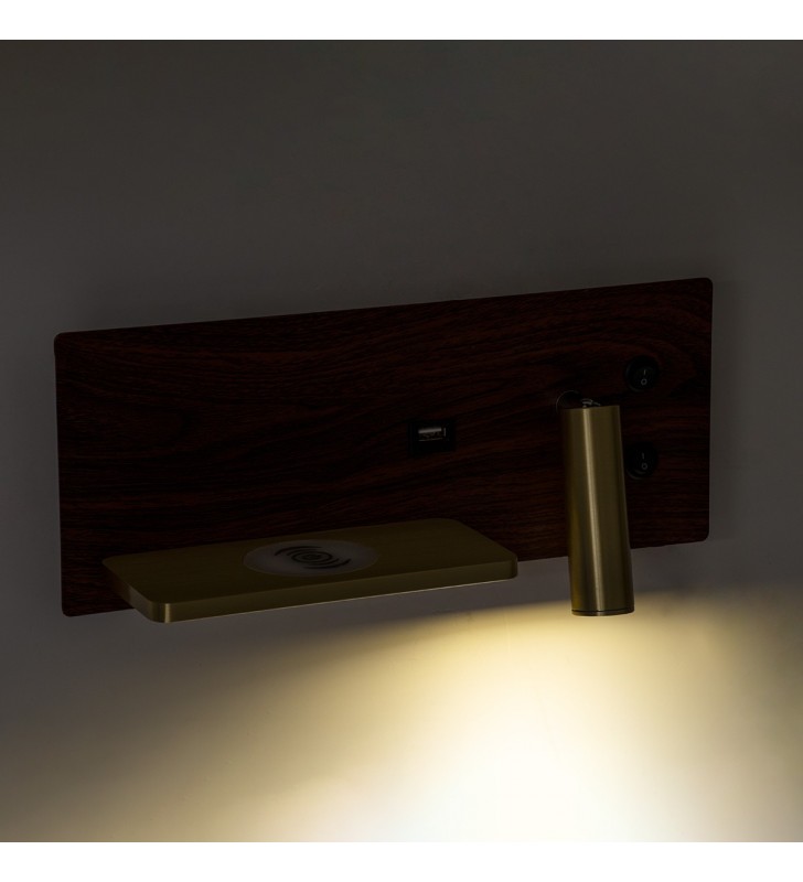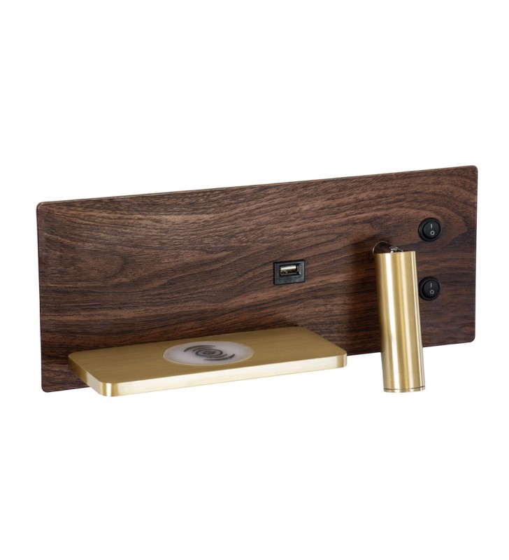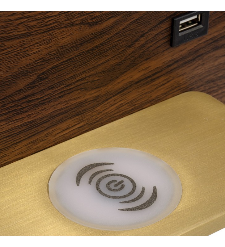 GloboStar® PALADIN 61361 Μοντέρνο Φωτιστικό Τοίχου - Απλίκα Ξενοδοχείου Bed Side LED 6W 720lm 36° AC 220-240V - Reading Light & Κρυφός Φωτισμός - Φορτιστές USB 3A & Wireless 20W - Μ30 x Π11 x Υ12cm - Φυσικό Λευκό 4500K - Ξύλο & Χρυσό - Αριστερό