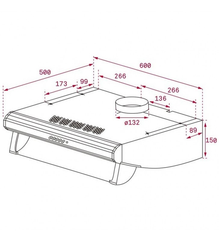 Επίπεδο θορύβου (dΒ): Μέγιστη ταχύτητα (LwA): 69 dB (*) Ελάχιστη ταχύτητα (LwA): 62 dB (*) Απορροφητική ικανότητα: Μέγιστη ταχύτητα: 329 m3/h (*) Ελάχιστη ταχύτητα: 223 m3/h (* ). Ενεργειακή κλάση: Δ (*) σύμφωνα με ΕΕ 65/2014. Εσωτερικές διαστάσεις: Εσωτερικό ύψος (mm): 175 Εξωτερικές διαστάσεις:Ύψος (mm) : 150 Πλάτος (mm): 600 Βάθος (mm): 500 Βάρος (Κgs): 8,05. Ιδιαίτερα χαρακτηριστικά Πιστοποιητικά: CE; CB; Rohs Διάμετρος εξόδου O (mm): 120 Κατανάλωση εσωτερικού φωτισμού(W): 1.5 Πρίζα: European plug Ισχύς (V): 230 Συχνότητα (Hz): 50 Συνολική ισχύς (W): 200 Ισχύς μοτέρ, (W): 188