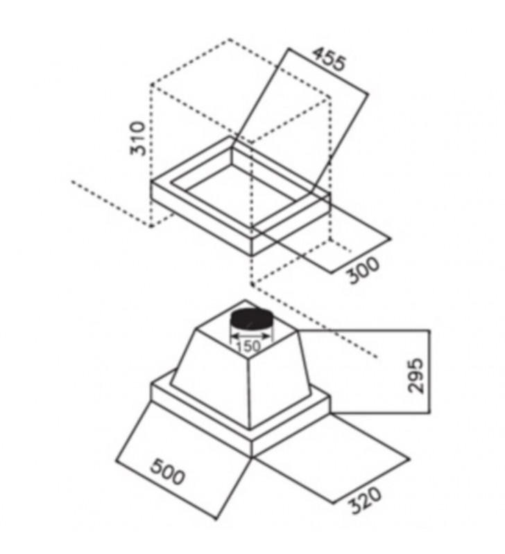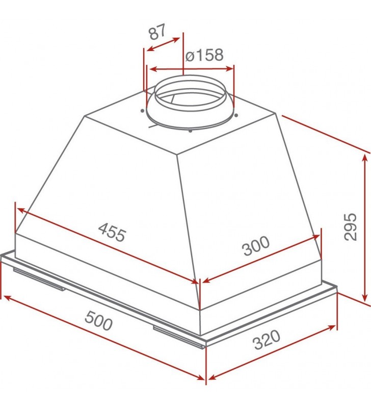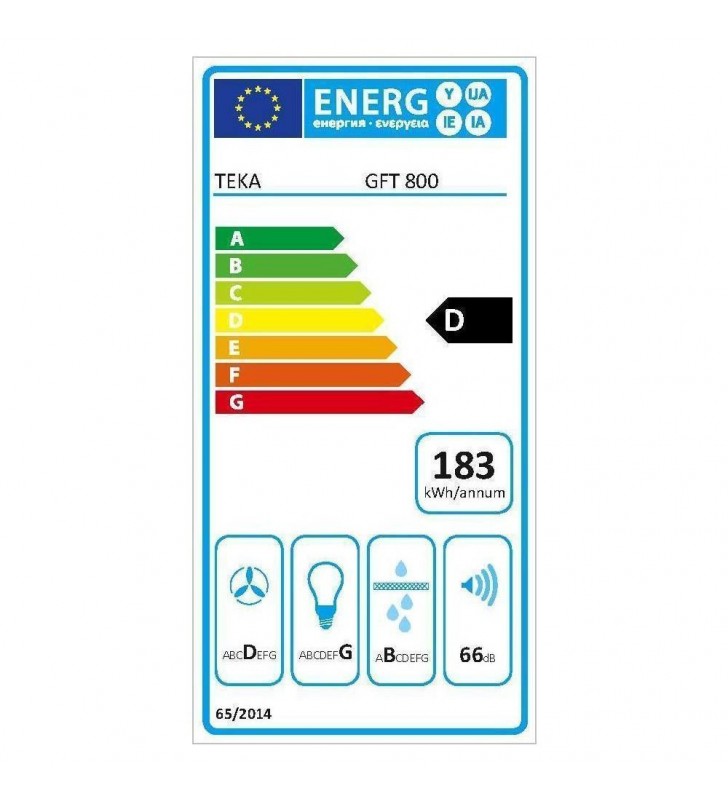 Επίπεδο θορύβου (dΒ): Μέγιστη ταχύτητα (LwA): 66 dB (*) Ελάχιστη ταχύτητα (LwA): 48 dB (*) Απορροφητική ικανότητα: Μέγιστη ταχύτητα: 653 m3/h (*) Ελάχιστη ταχύτητα: 280m3/h (*) . Ενεργειακή κλάση: Δ (*) σύμφωνα με ΕΕ 65/2014. Εσωτερικές διαστάσεις: Εσωτερικό ύψος (mm): 175 Εξωτερικές διαστάσεις:Ύψος (mm) : 295 Πλάτος (mm): 500 Βάθος (mm): 320 Βάρος (Κgs): 4,99. Ιδιαίτερα χαρακτηριστικά Πιστοποιητικά: CE; CB; Rohs Διάμετρος εξόδου O (mm): 120 Κατανάλωση εσωτερικού φωτισμού(W): 6 Πρίζα: European plug Ισχύς (V): 230-240 Συχνότητα (Hz): 50-60 Συνολική ισχύς (W): 242 Ισχύς μοτέρ, (W) : 230