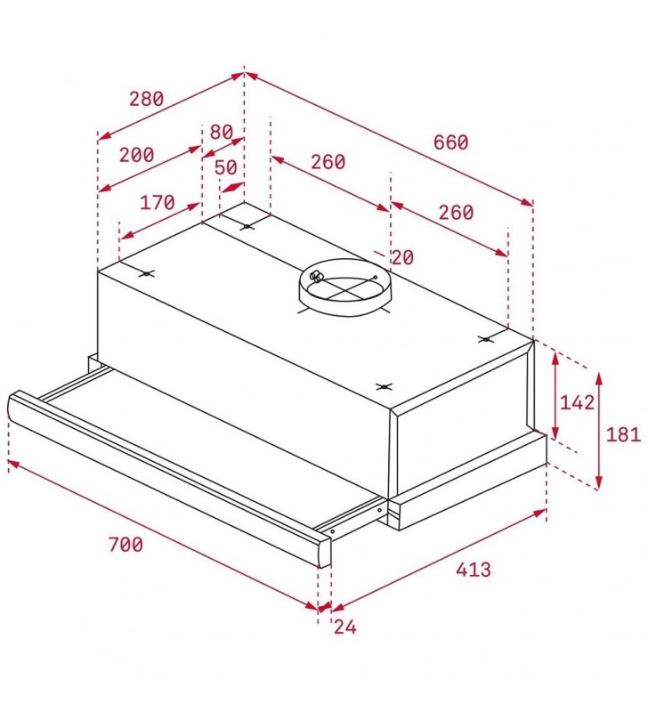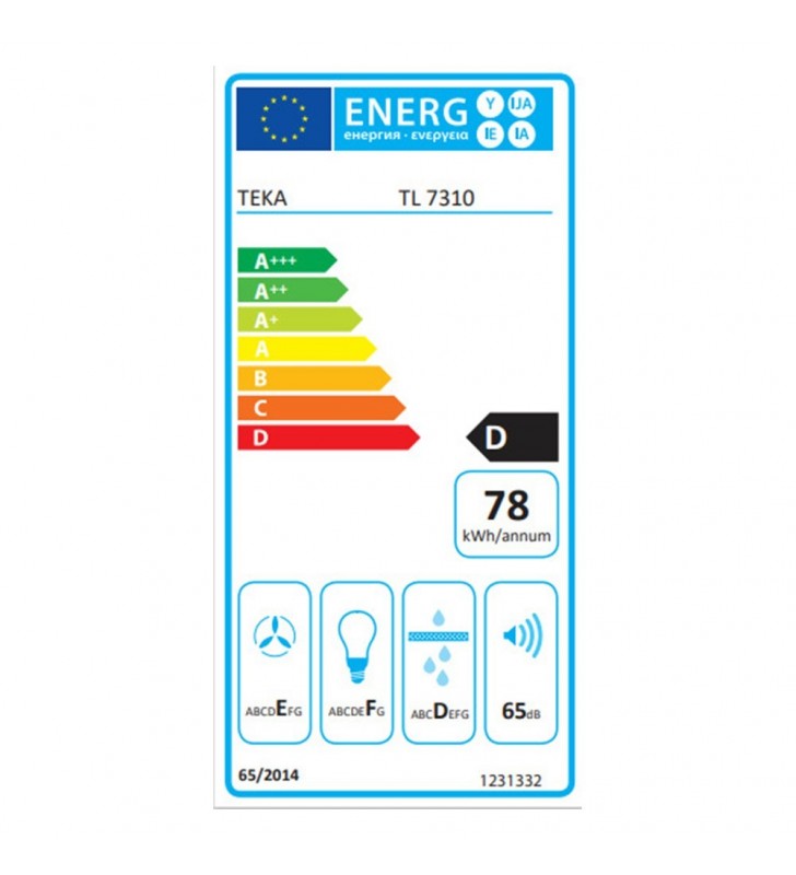 Δυνατότητα χρήσης φίλτρων ενεργού άνθρακα Επίπεδο θορύβου (dΒ):) Μέγιστη ταχύτητα (LwA): 65 dB (*) Ελάχιστη ταχύτητα (LwA): 49 dB (*) Απορροφητική ικανότητα: Μέγιστη ταχύτητα: 304 m3/h (*)Ενεργειακή κλάση: Δ(*) σύμφωνα με την ΕΕ 65/2014. Εξωτερικές διαστάσεις Ύψος (mm) : 181 Πλάτος (mm): 700 Βάθος (mm): 288/413 Βαρος (Κgs): 6,3. Ιδιαίτερα χαρακτηριστικά Διάμετρος εξόδου O (mm): 120