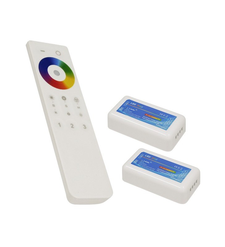 Το Ασύρματος LED RGB Controller με Χειριστήριο Αφής 2.4G RF για Δυο Group 12v (288w) - 24v (576w) DC GloboStar 04142 συμπεριλαμβάνει ένα τηλεχειριστήριο για τον απομακρυσμένο έλεγχο, μια επιτοίχια θήκη για το τηλεχειριστήριο, και δυο δέκτες με μέγιστο φορτίο 288 watt στα 12 volt και 576 watt στα 24 volt.