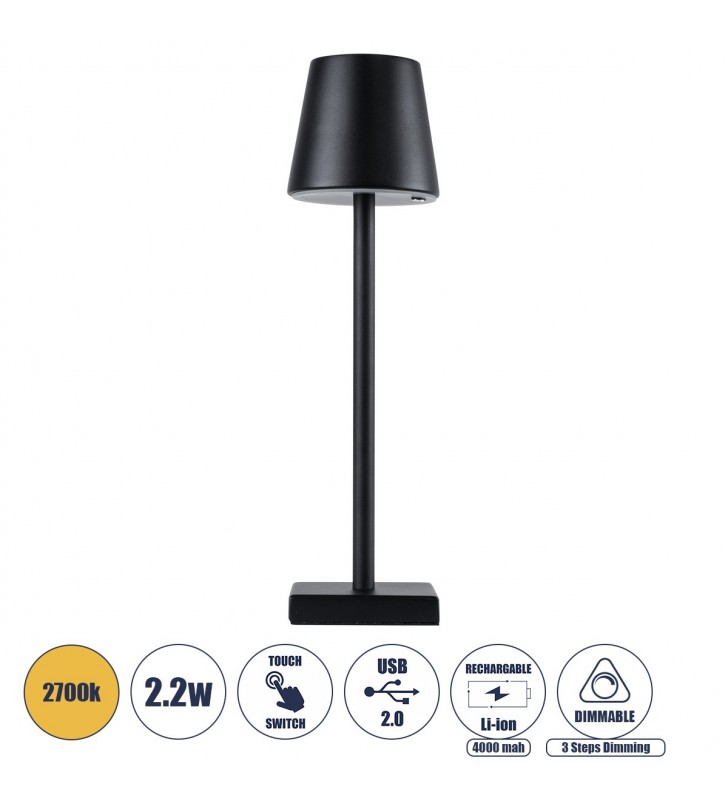GloboStar NEGA 60473 Επιτραπέζιο Φωτιστικό Πορτατίφ LED 2.2W DC 5V Επαναφορτιζόμενο 2700K - Μαύρο