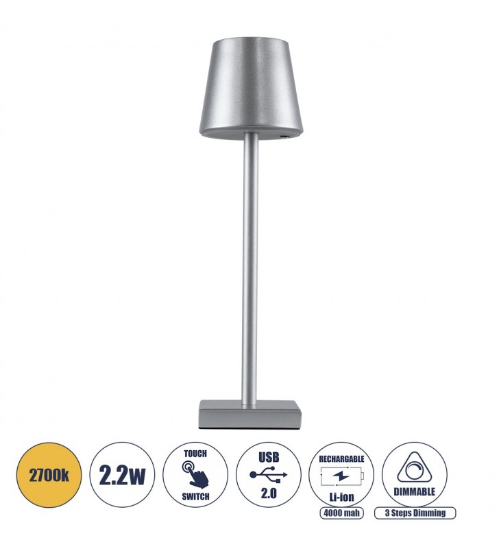 GloboStar NEGA 60476 Επιτραπέζιο Φωτιστικό Πορτατίφ LED 2.2W DC 5V Επαναφορτιζόμενο 2700K - Ασημί