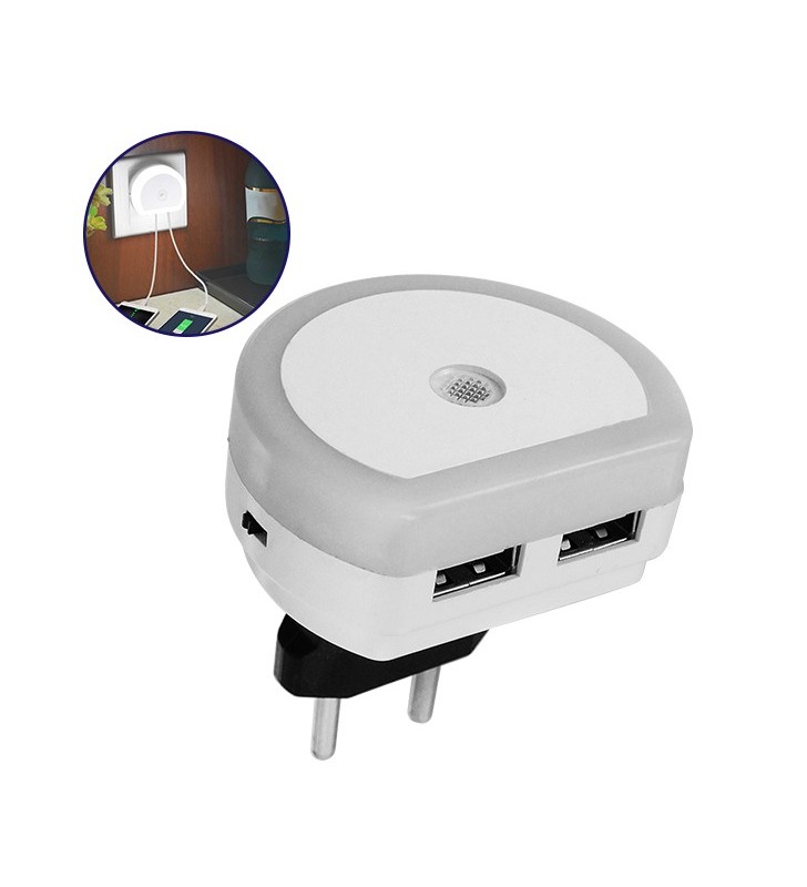 Φωτιστικό Νυκτός Πρίζας Φορτιστής LED Dual USB Charger με Αισθητήρα Μέρας Νύχτας GloboStar 07048