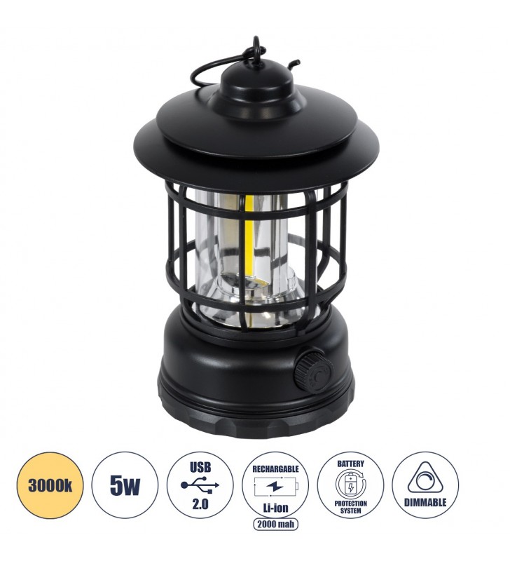 GloboStar 85692 Αυτόνομο Επαναφορτιζόμενο Φανάρι Camping LED 5W - Dimmable - Μαύρο - 3000K