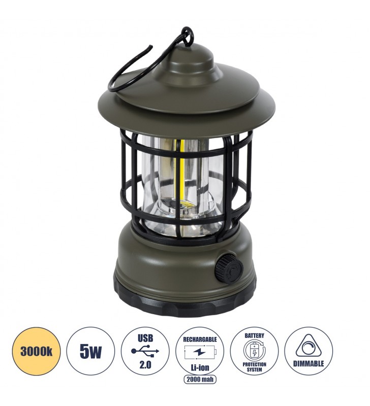 GloboStar 69931 Αυτόνομο Ηλιακό Επαναφορτιζόμενο Φανάρι Camping LED 5W Dim - Μαύρο, 1800K - 6000K