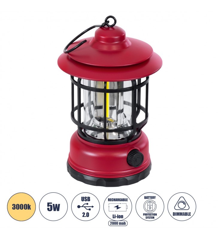 GloboStar 85694 Αυτόνομο Επαναφορτιζόμενο Φανάρι Camping LED 5W - Dimmable - Κόκκινο - 3000K