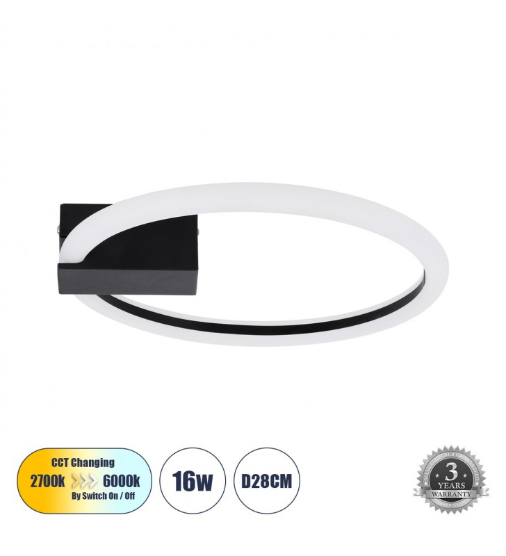 GloboStar CINDERELLA 60976 Φωτιστικό Οροφής Δαχτυλίδι-Κύκλος LED CCT 16W 1792lm 360° AC 220-240V - Εναλλαγή Φωτισμού μέσω Διακόπτη On/Off All In One Ψυχρό 6000k+Φυσικό 4500k+Θερμό 2700k Φ28cm - Μαύρο - 3 Years Warranty
