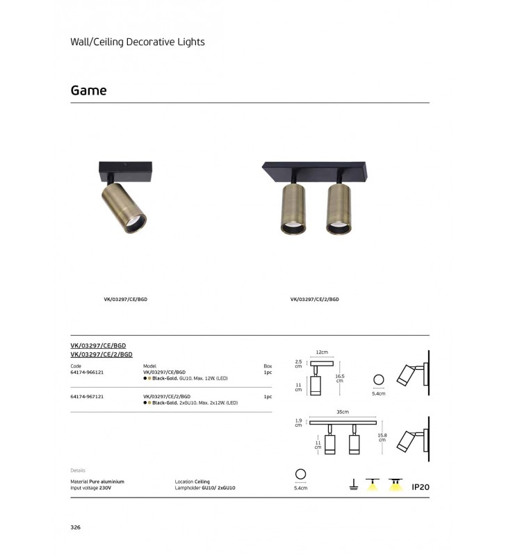 Φωτιστικό τοίχου, μαύρο-χρυσό. GU10. Max. 12W. (LED). IP20