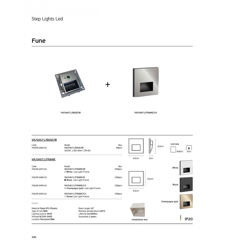 Βάση για Φωτιστικό σκαλοπατιών Led, 3000K. 1.5W. 80lm. CRI>80. IP20