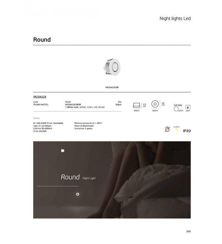 Χωνευτό φωτιστικό νυκτός led, 1W, 3000K, 110lm, CRI>80, IP20, λευκό