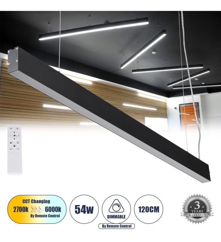 GloboStar® FELIX 61028-P Γραμμικό Κρεμαστό Φωτιστικό Linear LED CCT 54W 6500lm 120° AC 220-240V Μ120 x Π3.5 x Υ7cm - Εναλλαγή Φωτισμού μέσω Τηλεχειριστηρίου All In One Ψυχρό 6000k+Φυσικό 4500k+Θερμό 2700k Dimmable - Μαύρο - 3 Years Warranty