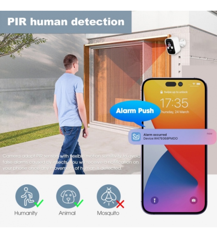 Η κάμερα έχει αισθητήρα PΙR που ανιχνεύει το ανθρώπινο σώμα, εκμηδενίζοντας τις λανθασμένες ειδοποιήσει από έντομα ή ζώα.