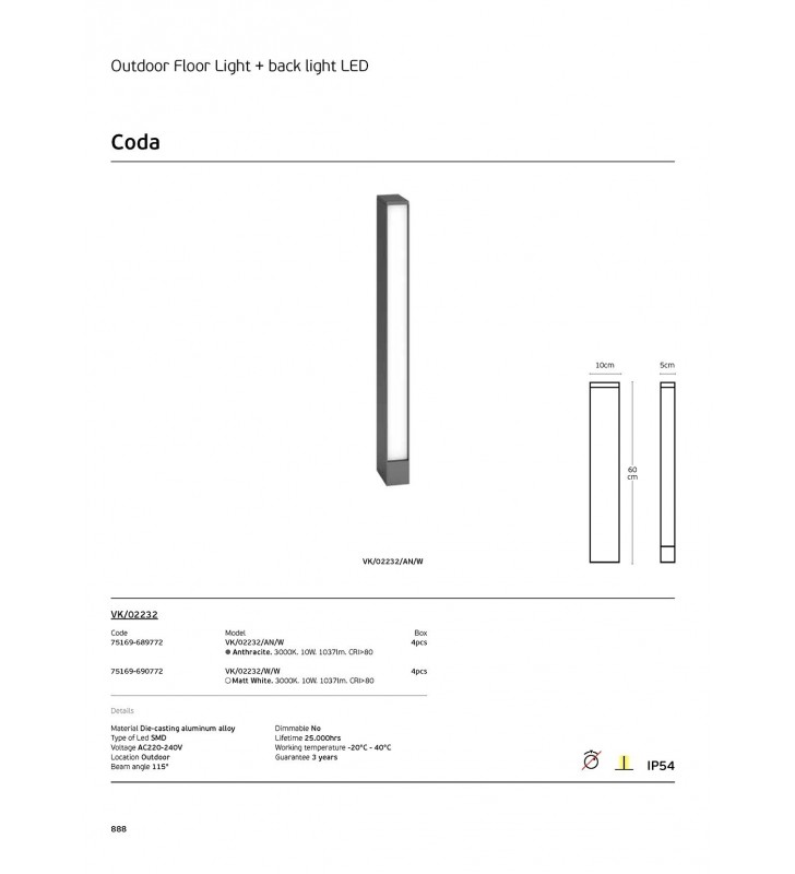 Φωτιστικό Led δαπέδου + back light Led, 3000K, 10W, 1037lm, 115°, CRI>80, 10x5xL60cm, IP54, ανθρακί