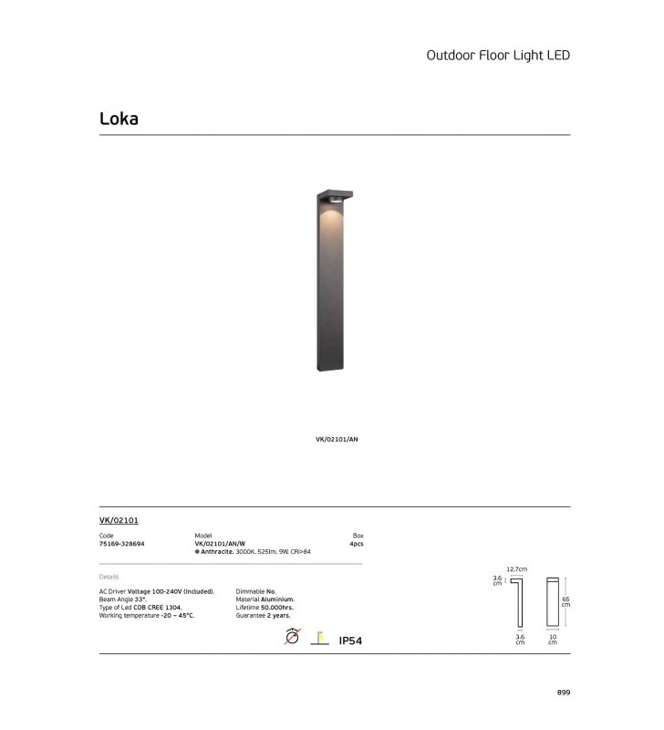 Φωτιστικό Led δαπέδου, 100-240V, 9W, 3000K, 525lm, 33°, CRI>84, IP54, 10x12.7x65cm, ανθρακί
