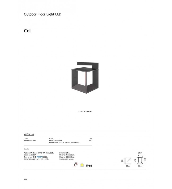 Φωτιστικό Led δαπέδου, 200-240V, 18W, 3000K, 737lm, 81°, CRI>84, IP65, 22x22x32cm, ανθρακί