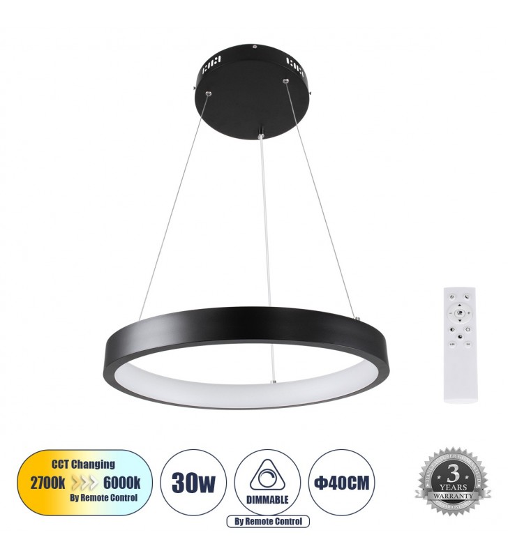 GloboStar® NEMESIS 61155 Κρεμαστό Φωτιστικό Δαχτυλίδι-Κύκλος LED CCT 30W 3513lm 360° AC 220-240V - Εναλλαγή Φωτισμού μέσω Τηλεχειριστηρίου All In One Ψυχρό 6000k+Φυσικό 4500k+Θερμό 2700k Dimmable Φ40cm - Μαύρο - 3 Years Warranty