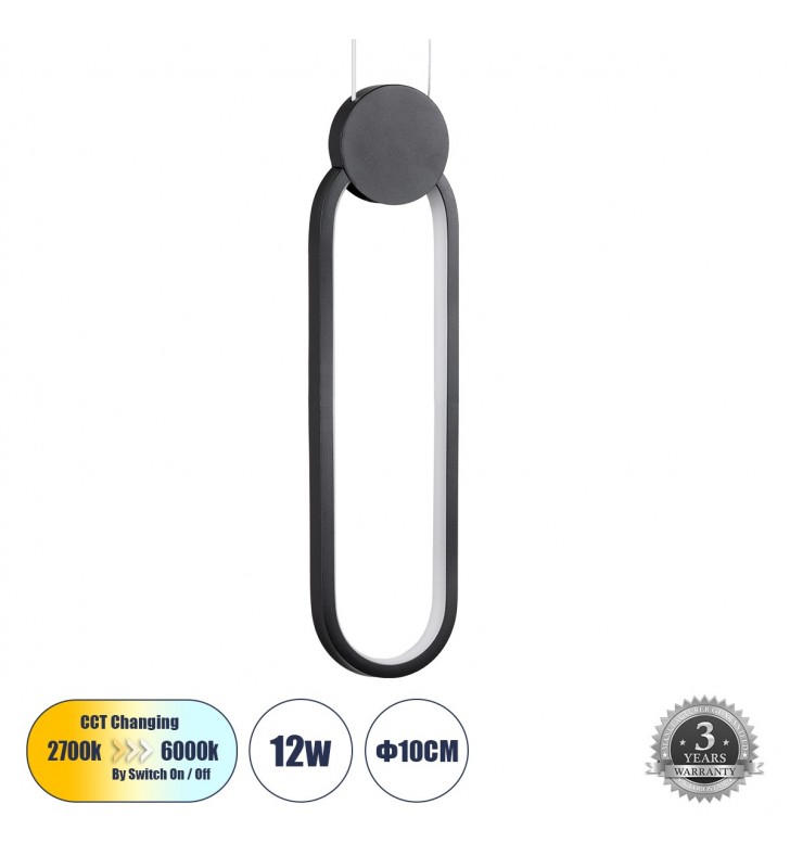 GloboStar® ILDI 61088 Κρεμαστό Φωτιστικό Οροφής Design LED CCT 12W 1440lm 300° AC 220-240V - Εναλλαγή Φωτισμού μέσω Διακόπτη On/Off All In One Ψυχρό 6000k+Φυσικό 4500k+Θερμό 2700k Μ10 x Π2.3 x Υ38cm - Μαύρο
