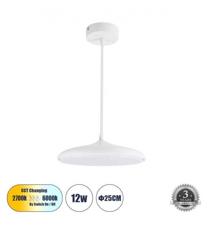 GloboStar® BARON 61252 Κρεμαστή Πλαφονιέρα Οροφής LED CCT 12W 1440lm 120° AC 220-240V - Εναλλαγή Φωτισμού μέσω Διακόπτη On/Off All In One Ψυχρό 6000k+Φυσικό 4500k+Θερμό 2700k Φ25 x Υ8cm - Λευκό - 3 Years Warranty