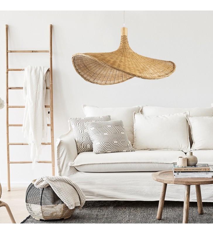 GloboStar CUBA 01717 Vintage Κρεμαστό Φωτιστικό Οροφής Μονόφωτο Μπεζ Ξύλινο Bamboo Φ43 x Y30cm