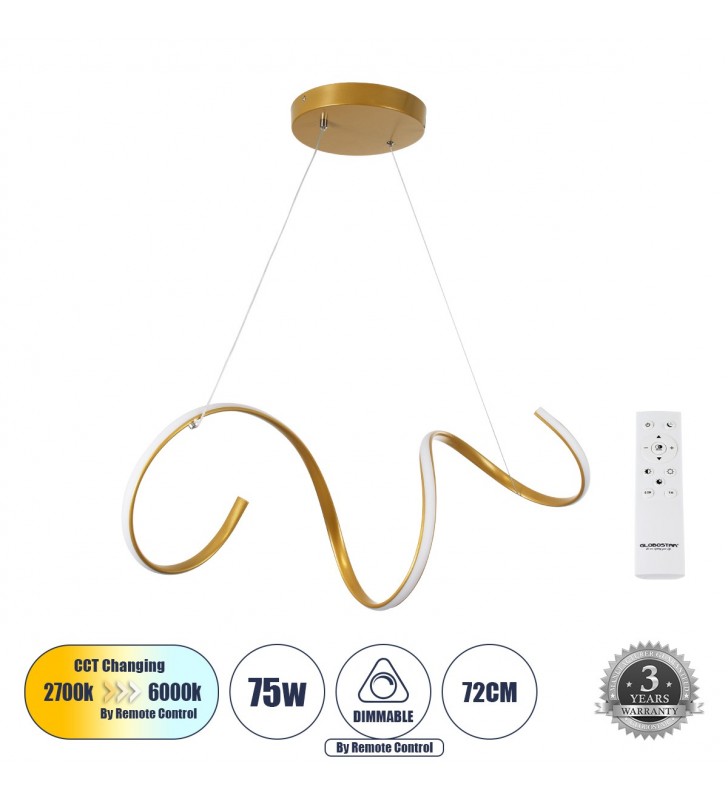 GloboStar® SPIRALE 61286 Κρεμαστό Φωτιστικό Οροφής Design LED CCT 75W 8400lm 300° AC 220-240V - Εναλλαγή Φωτισμού μέσω Τηλεχειριστηρίου All In One Ψυχρό 6000k+Φυσικό 4500k+Θερμό 2700k Dimmable Μ72 x Π25 x Υ18cm - Χρυσό Βούρτσας - 3 Years Warranty