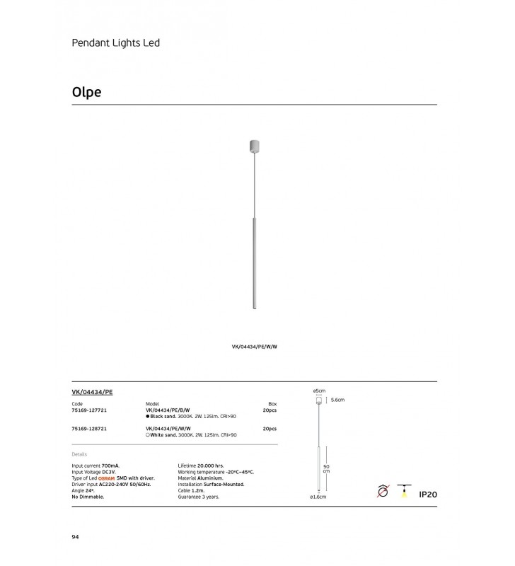 Φωτιστικό Led κρεμαστό, 220-240V, 2W, 3000K, 125lm, CRI>90, IP20, o1.6x50cm, λευκό
