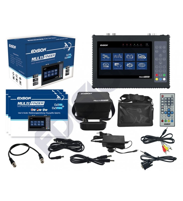 To EDISION MULTI-FINDER είναι ένα πρωτοποριακό, όλα-σε-ένα, ηλεκτρονικό όργανο μετρήσεων, για εγκαταστάσεις τηλεοπτικών συστημάτων (Δορυφορικού και Επίγειου Ψηφιακού) αλλά και για εγκαταστάσεις CCTV! Το MULTI-FINDER μεταξύ άλλων σας παρέχει: Μέτρηση Δορυφορικού, Επίγειου Ψηφιακού και Καλωδιακού τηλεοπτικού σήματος και ενσωματωμένο CCTV Tester! «Διαβάζει» HEVC Η.265 στο TV tuner και διαθέτει: Αναλυτή Φάσματος, Constellation, έξοδο τροφοδοσίας προς LNB και Επίγεια Κεραία, 6000 κανάλια μνήμη και λίστα Αγαπημένων. Για τις CCTV εγκαταστάσεις σας, δίνει εικόνα από σήμα καμερών AHD, TVI, CVI, CVBS με είσοδο BNC και AV, ενώ παρέχει και DC τροφοδοσία καμερών, RS485 για PTZ, BNC και HDMI & AV εξόδους για εικόνα/δοκιμή σε ανεξάρτητη οθόνη, HDMI & AV εισόδους για δοκιμή δεκτών και συσκευών Audio/Video! Τα πλούσια χαρακτηριστικά του περιλαμβάνουν επίσης: 7 οθόνη LCD, αποσπώμενη μπαταρία Λιθίου 6300mAh, USB WiFi σύνδεση για YouTube, RSS, Καιρό, ενώ είναι και αναβαθμίσιμο μέσω USB & HTTP. Επιπλέον, μέσα στην εργοστασιακή του συσκευασία περιλαμβάνει: Θήκη προστασίας, Τσάντα μεταφοράς, Τηλεχειριστήριο, Φορτιστή αυτοκινήτου, Καλώδιο Jack-AV, Jack-RS232, BNC-BNC, DC αντάπτορα, και τροφοδοτικό!