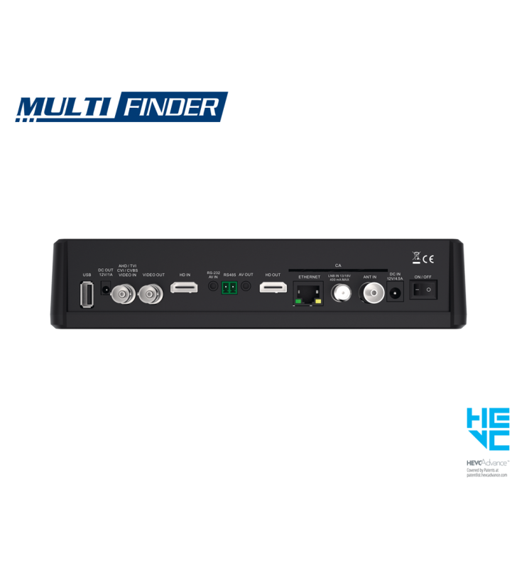 - Θύρες: DC IN, ANT IN, LNB IN, LAN, HD OUT, AV OUT, RS485, RS232/AV IN, HD IN, BNC OUT, BNC IN, DC OUT, USB