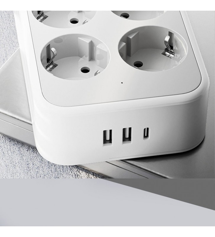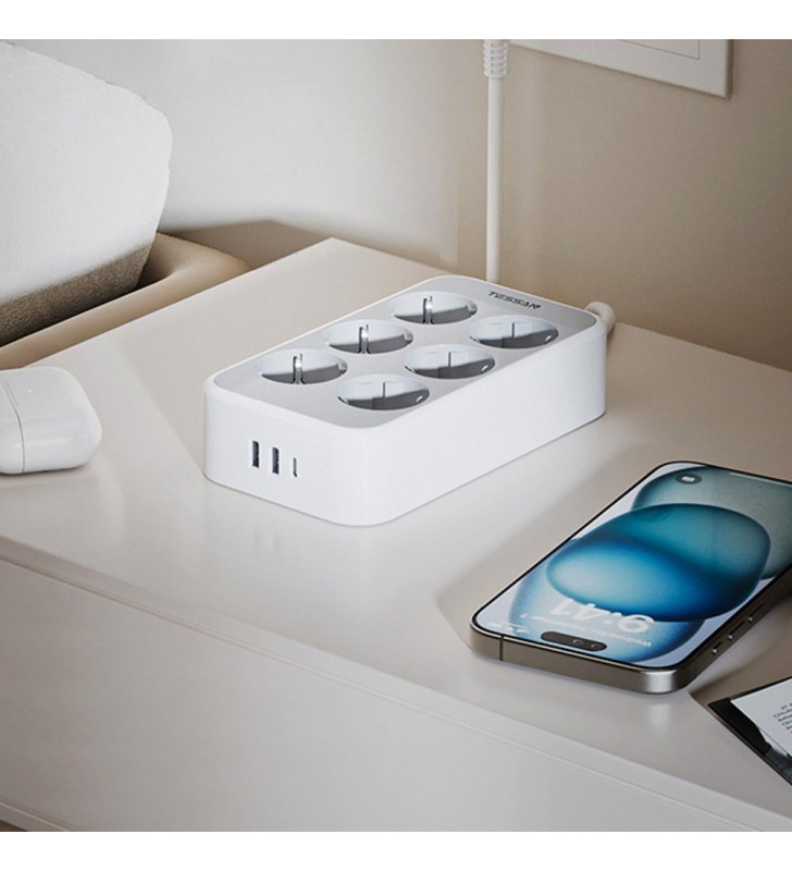 Το πολύπριζο διαθέτει έξι πρίζες AC και τρεις θύρες USB - δύο USB-A και μία USB-C. Αυτό σημαίνει ότι μπορείτε ταυτόχρονα να τροφοδοτείτε οικιακές συσκευές όπως φώτα, λάπτοπ και τηλεοράσεις, ενώ φορτίζετε το τηλέφωνό σας, το tablet ή άλλες συσκευές. Η θύρα USB-C υποστηρίζει γρήγορη φόρτιση έως και 25W, ιδανική για γρήγορη ανανέωση των πιο σύγχρονων συσκευών σας.