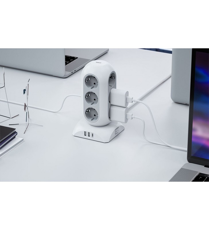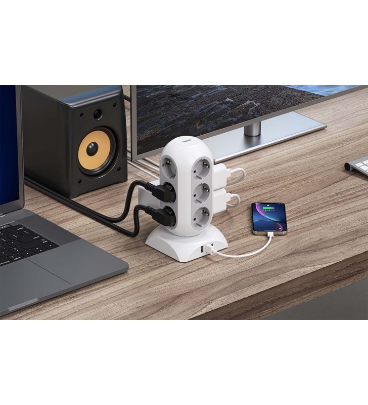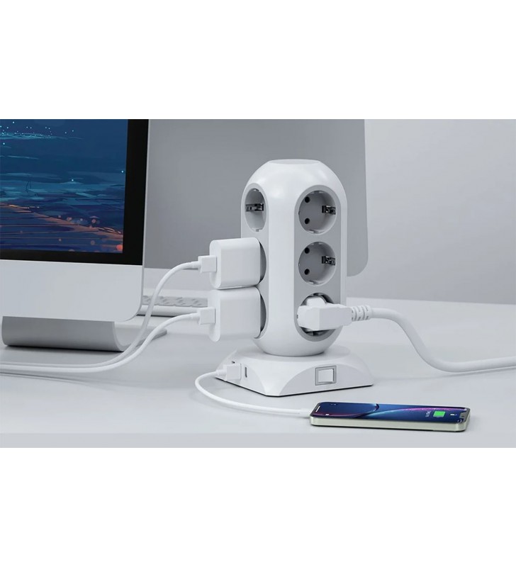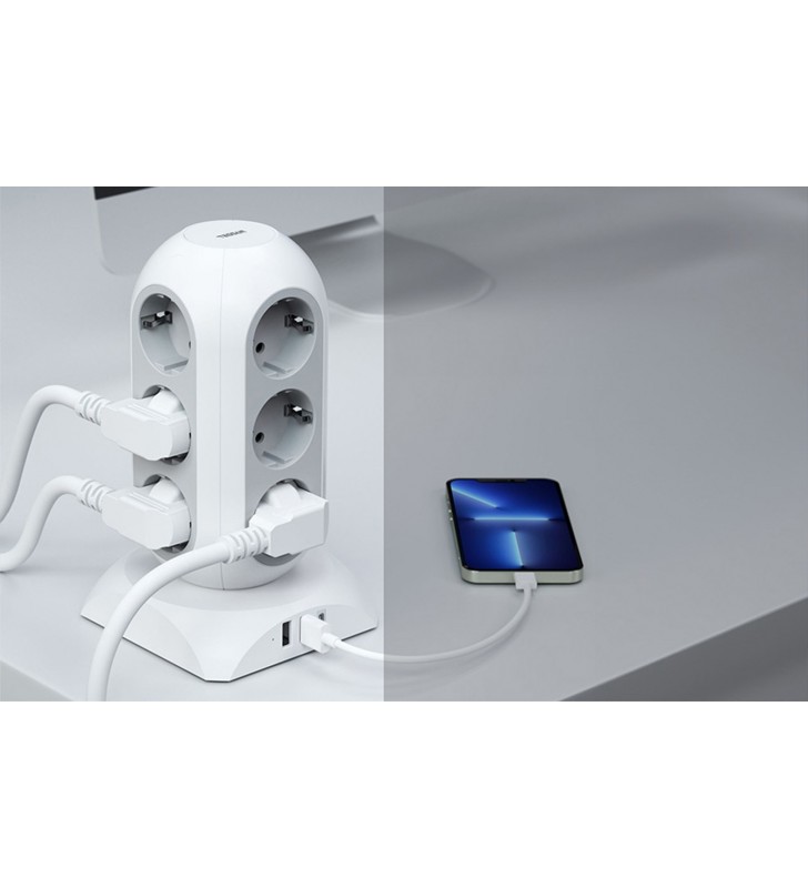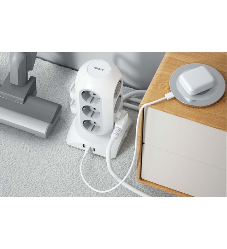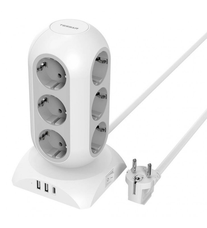 TESSAN 15 IN 1 TOWER SURGE PROTECTOR 25W 12xSCHUKO, 2xUSB, 1xTYPE-C, 2M CABLE WHITE - TESSAN (TPS02-DE-C)