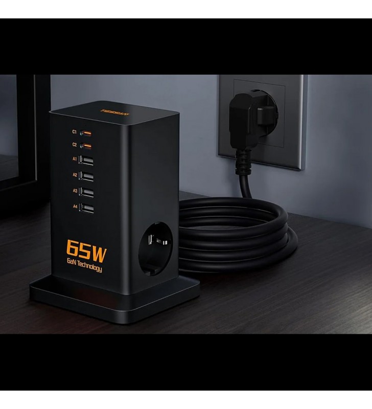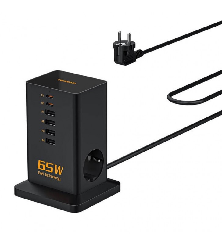 TESSAN 8 IN 1 GaN POWER STRIP 2xSCHUKO 4xUSB 2xTYPE-C 65W WITH CABLE 2M BLACK - TESSAN (TS-FS02DE00)