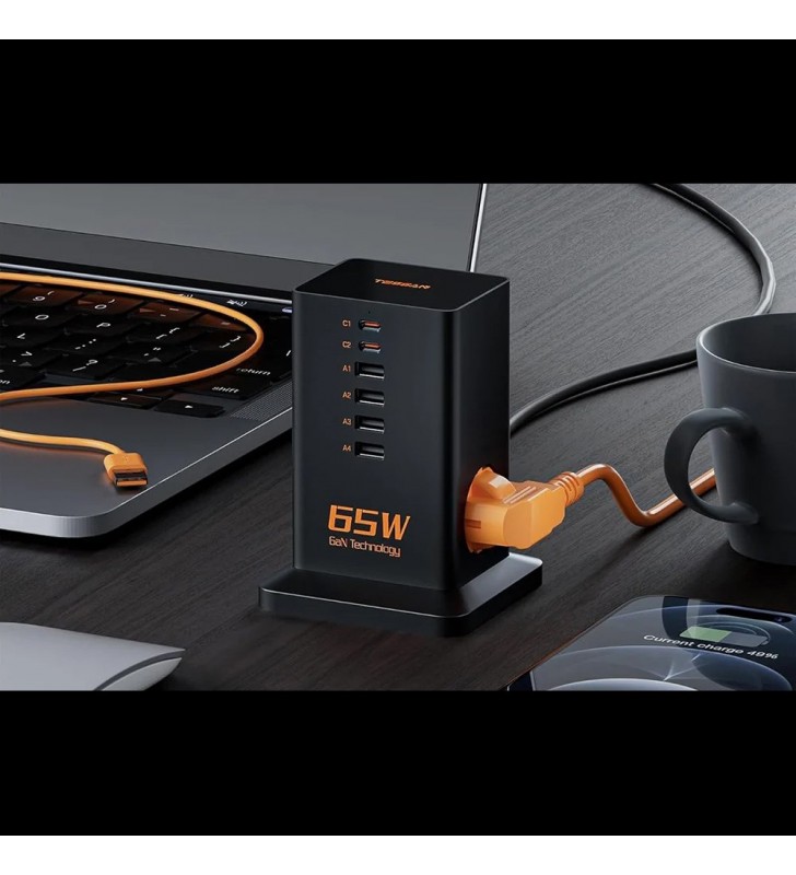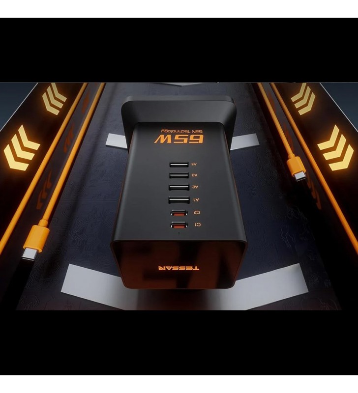 Η <strong>TESSAN TS-FS02DE00</strong> διαθέτει συνολικά <strong>6 θύρες USB</strong> — 2 θύρες USB-C και 4 θύρες USB-A, επιτρέποντάς σας να φορτίζετε ταυτόχρονα έως <strong>6 συσκευές</strong> όπως smartphones, tablets, ακουστικά ή άλλες ηλεκτρονικές συσκευές.