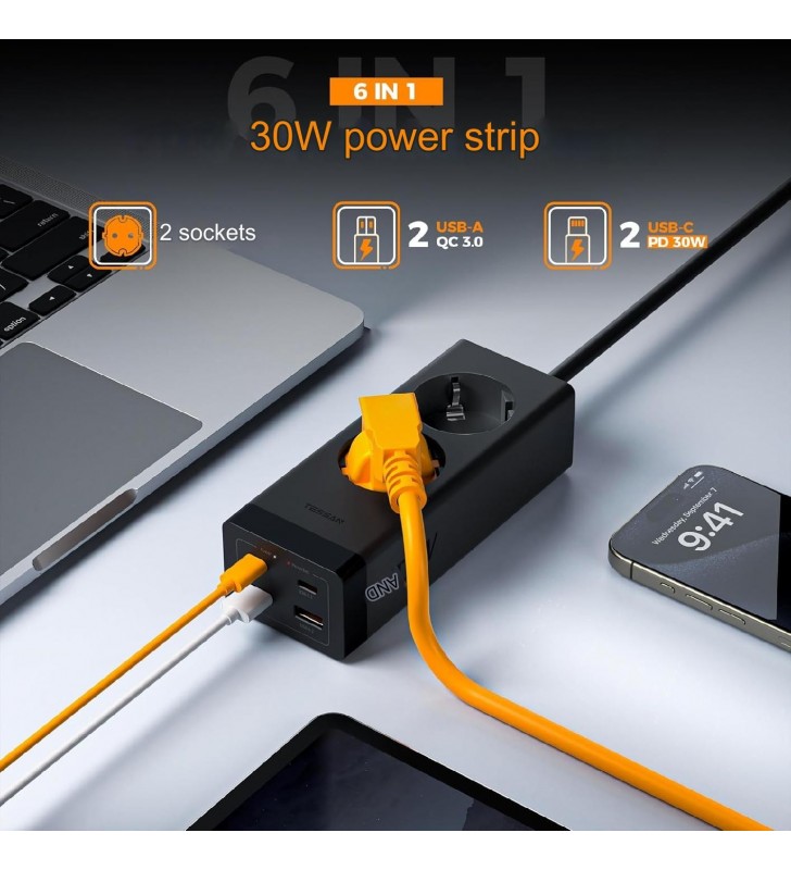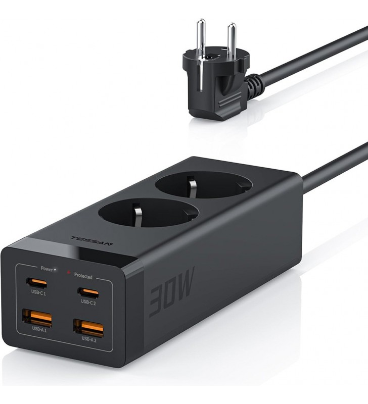 TESSAN 6 IN 1 POWER STRIP 2xSCHUKO 2xUSB 2xTYPE-C 30W WITH CABLE 2M BLACK - TESSAN (TS-FS01DE00)