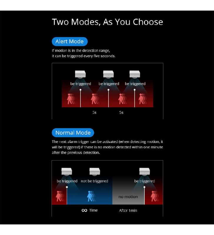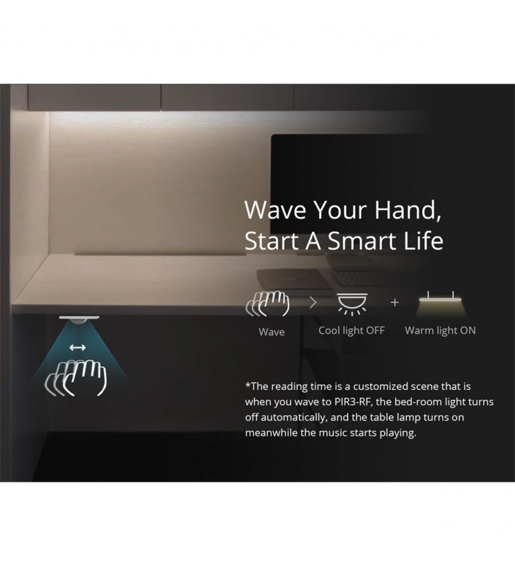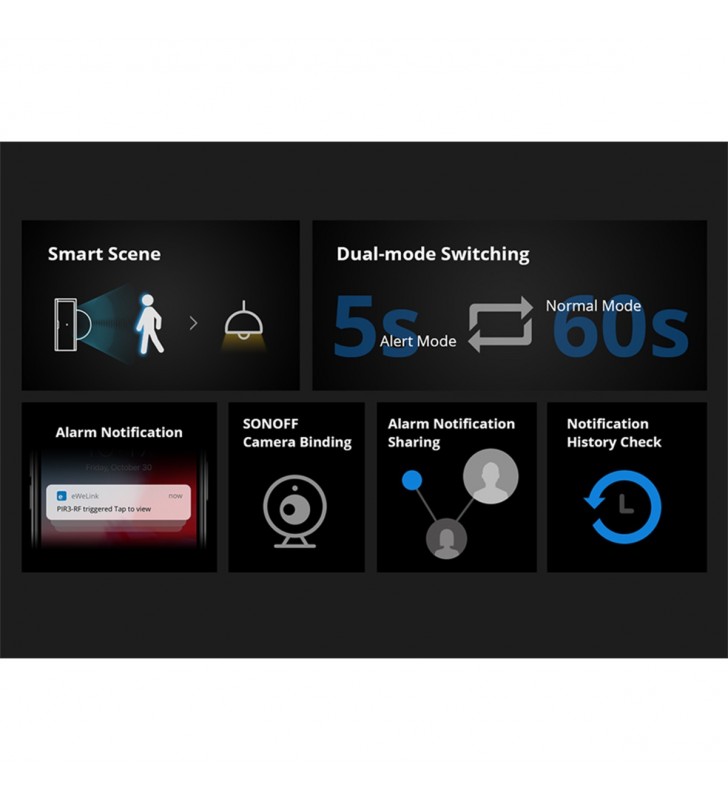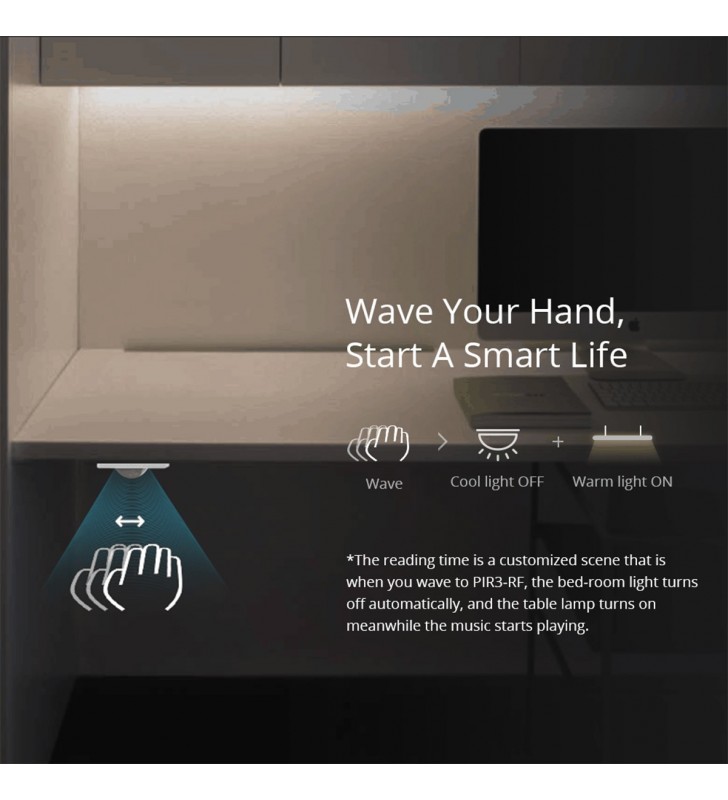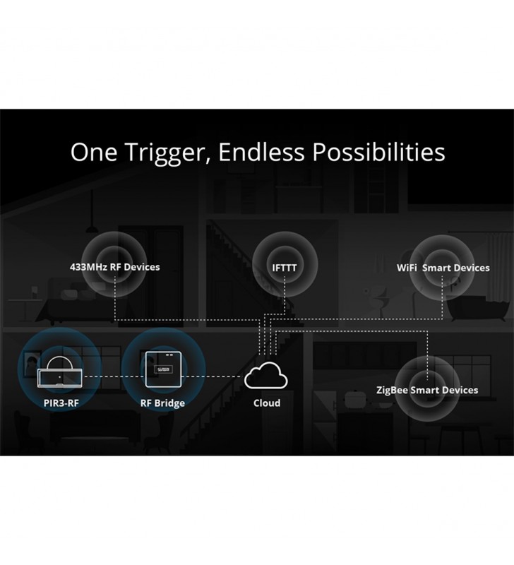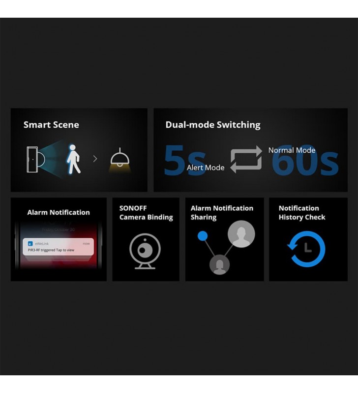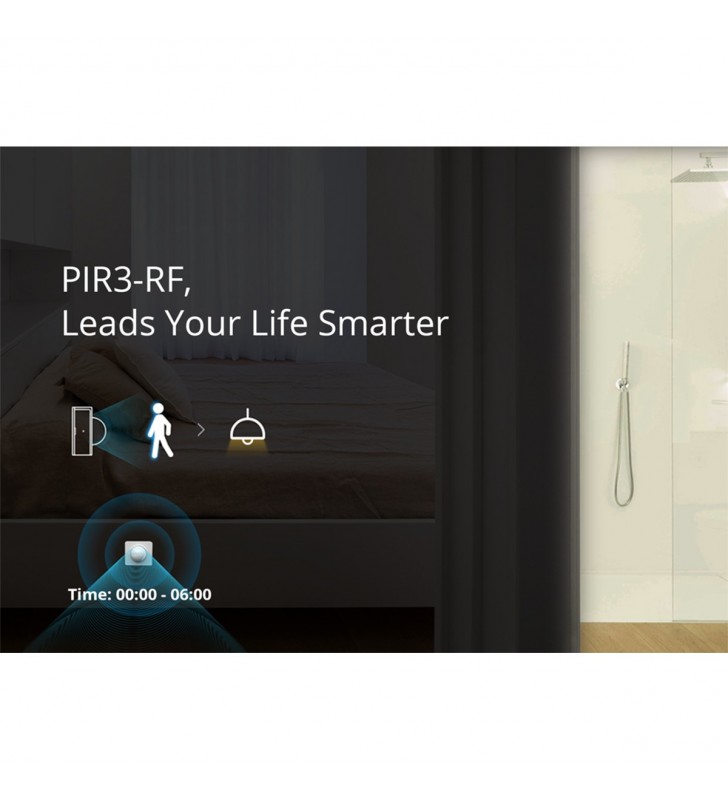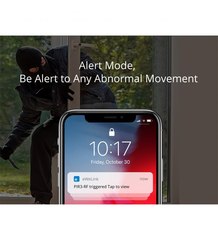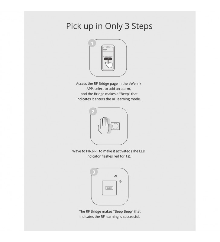 Extra Informations - Επιπλέον Πληροφορίες : Pick up in Only 3 Steps 1) Access the RF Bridge page in the eWelink APP, select to add an alarm, and the Bridge makes a “Beep” that indicates it enters the RF learning mode. 2) Wave to PIR3-RF to make it activated (The LED indicator flashes red for 1s). 3) The RF Bridge makes “Beep Beep” that indicates the RF learning is successful.