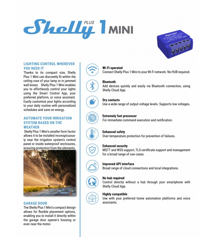 Ο μικρότερος διακόπτης ρελέ στον κόσμο για έξυπνο έλεγχο. Αυτοματοποιήστε τα φώτα, τη γκαραζόπορτα, το σύστημα άρδευσης ή άλλες μικρές ηλεκτρικές συσκευές σας σε λιγότερο από 10 λεπτά και ελέγξτε τα από οπουδήποτε. Αρκετά μικρό ώστε να χωράει πίσω από κάθε διακόπτη τοίχου ή πρίζα, το Shelly Plus 1 Mini μπορεί να τοποθετηθεί εκ των υστέρων και είναι εξαιρετικά συμβατό με το υπάρχον έξυπνο οικοσύστημά σας.?