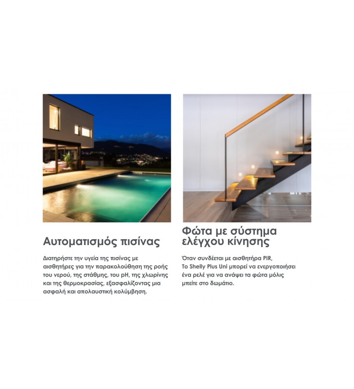 Το Shelly Plus Uni δεν είναι απλώς μια συσκευή- είναι ένα εργαλείο για να κατανοήσετε καλύτερα το περιβάλλον σας. Χρησιμοποιήστε το για να μετρήσετε τη θερμοκρασία και την υγρασία με την είσοδο 1-Wire ή συνδέστε το με μια ποικιλία αναλογικών και ψηφιακών αισθητήρων. Οι δυνατότητές του είναι τεράστιες, ανάλογα με τους αισθητήρες που θα επιλέξετε.
