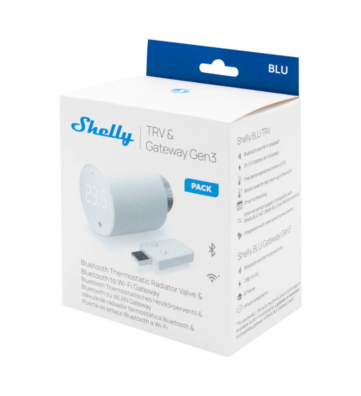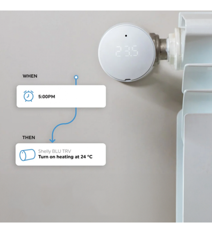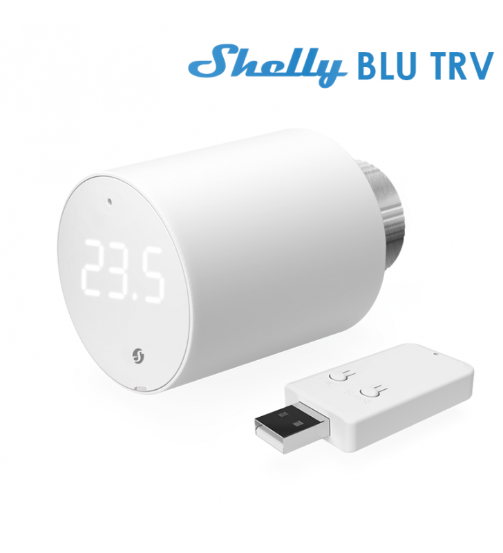 • Shelly BLU TRV είναι μια έξυπνη θερμοστατική κεφαλή για θερμαντικά σώματα, που λειτουργεί με Bluetooth. Ρυθμίζει τη θερμοκρασία ενός δωματίου ελέγχοντας τη ροή του ζεστού νερού μέσω του καλοριφέρ. Μπορείτε να αλλάξετε τη θερμοκρασία ανά πάσα στιγμή, είτε μέσω του περιστροφικού επιλογέα είτε μέσω της εφαρμογής σας στο κινητό, το tablet ή τον υπολογιστή. Υποστηρίζει προγραμματισμό θερμοκρασίας βάσει εβδομαδιαίου προγράμματος και απαιτεί 2 μπαταρίες AA 1,5 V.Κύριες Λειτουργίες: