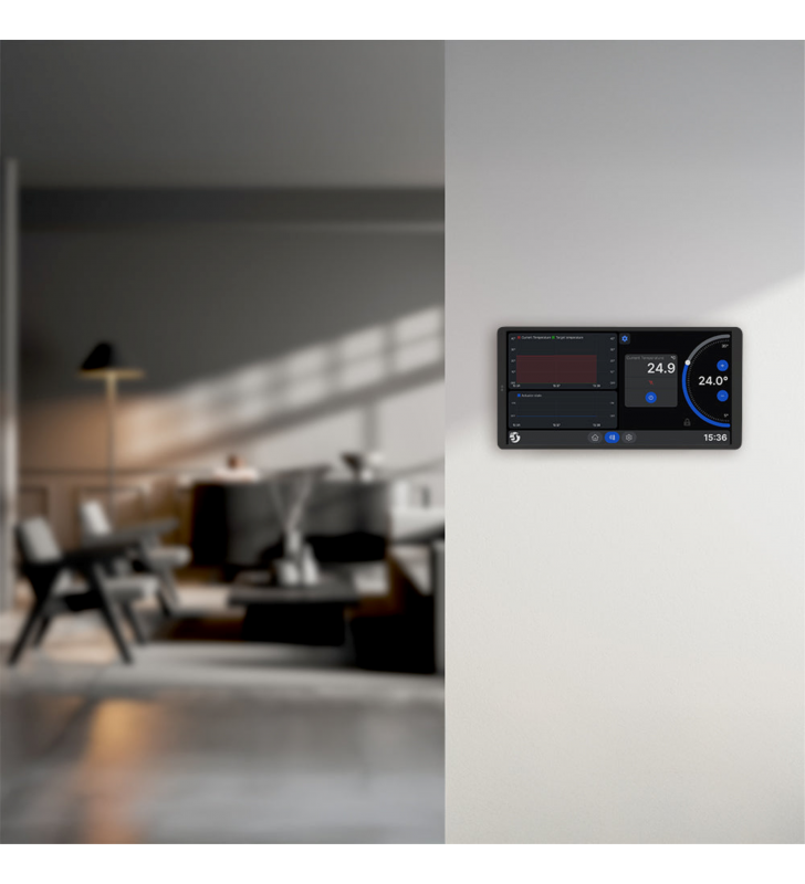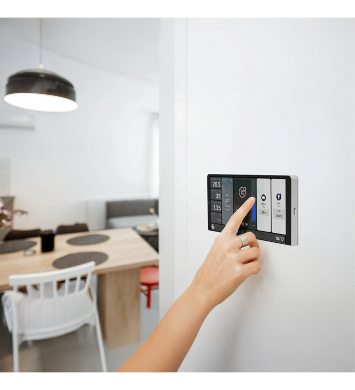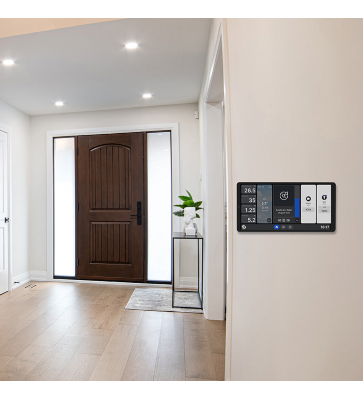 Έξυπνος πίνακας ελέγχου οικιακών συσκευών με έγχρωμη οθόνη αφής 6,95 ιντσών, εξαιρετικά γρήγορο τετραπύρηνο επεξεργαστή και εναλλάξιμη βάση τροφοδοσίας. Η βάση τροφοδοσίας που περιλαμβάνεται διαθέτει μία έξοδο για έλεγχο ενός κυκλώματος. Έγχρωμη οθόνη αφής 6,95 ιντσών (πανοραμική ή κατακόρυφη προβολή)