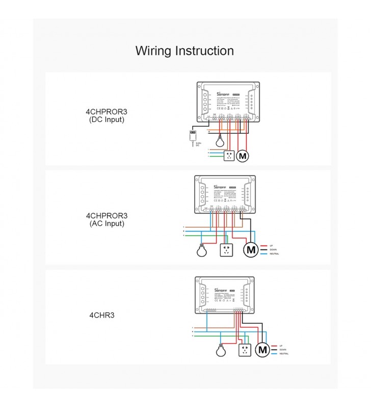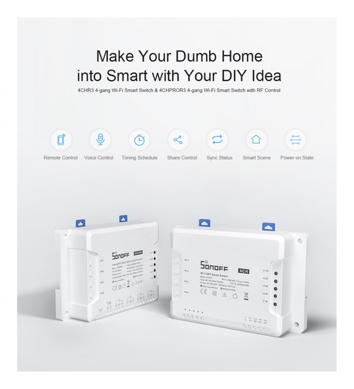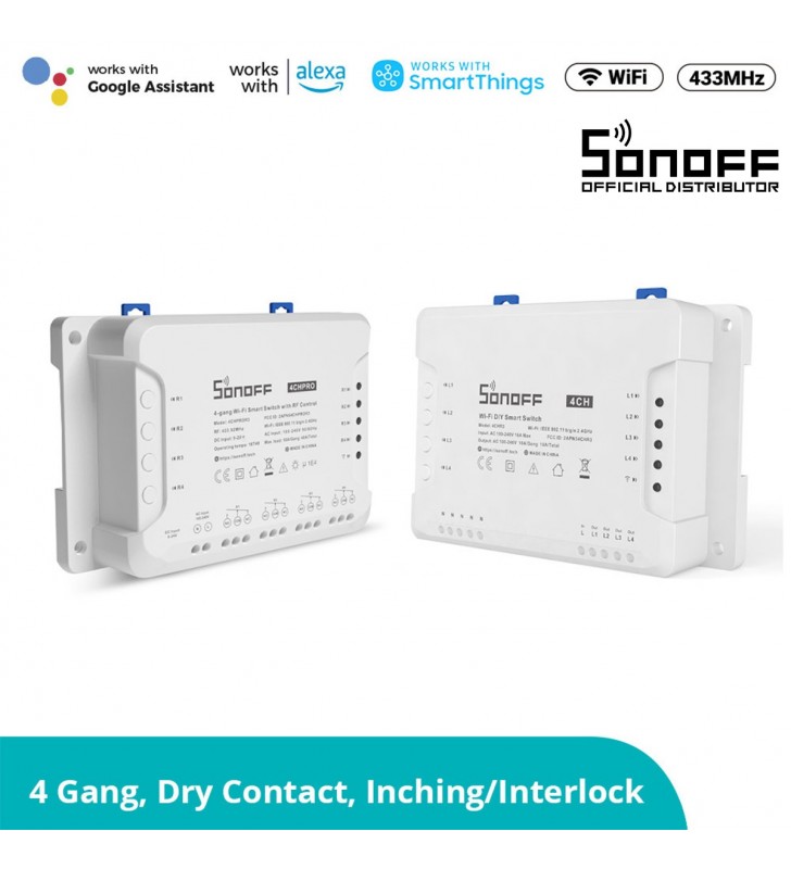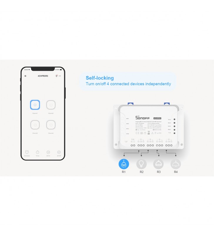 SONOFF 4CHR3 & 4CHPROR3 are both 4-gang Wi-Fi Smart Switches designed to give you the ability to integrate smart control into your existing home to enable a smart home. Each smart switch has 4 gangs that can be used to control lights and other home appliances at the same time in four areas of your home. There is a major difference between 4CHR3 and 4CHPROR3, which is 4CHPROR3 is designed with an additional function for RF control. The function is purposely adopted to make you turn on/off the device connected with 4CHPROR3 via the RM433 remote controller.