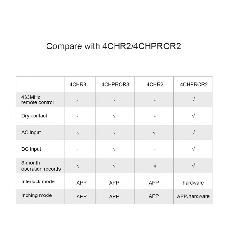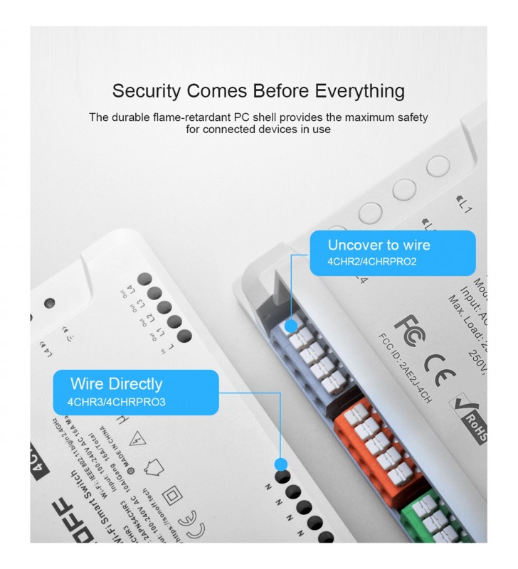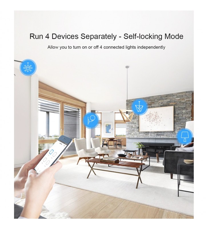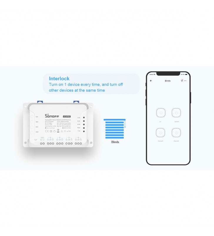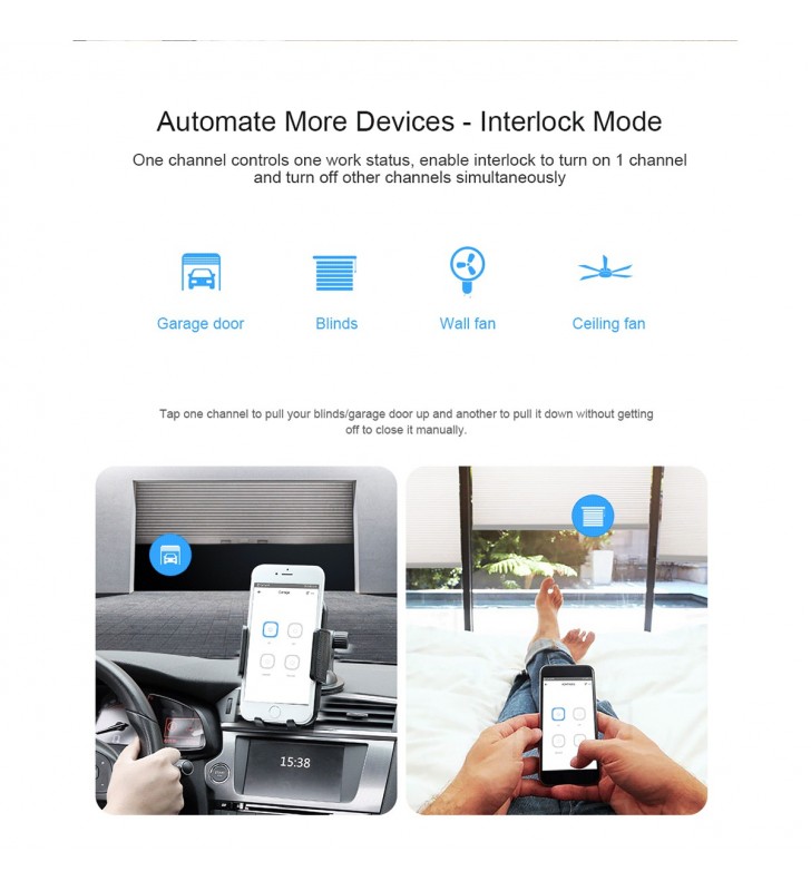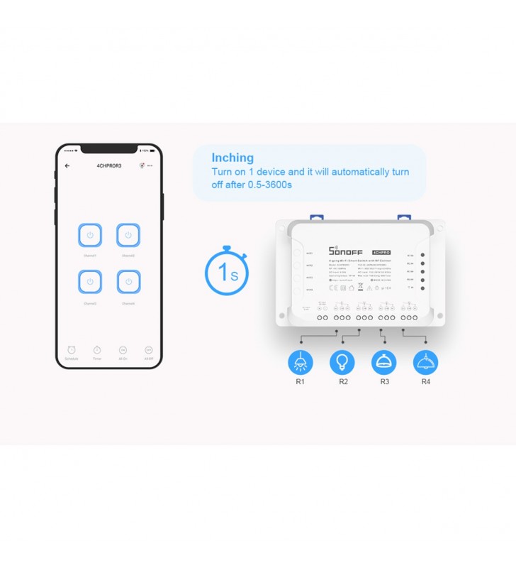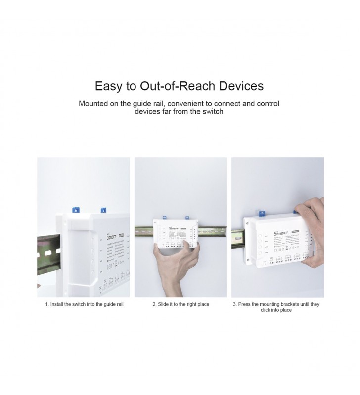 The new improvement on 4CHR3 and 4CHPROR3 compared with 4CHPR2 and 4CHPROR2 is for users to set these 3 working modes on eWeLink APP instead of the hardware itself, easier to operate. So you can enable self-locking mode to turn on/off 4 connected devices separately, interlock mode to turn on 1 connected device every time and turn off the rest of devices simultaneously and inching mode to turn on 1 connected device and then make it turn off automatically after a given time (0.5 - 3600s). For the device away from the switch, you can create a moveable space in virtue of a DIN rail to make them be connected. Simply activate devices through your voice when the switch works with Alexa and Google Home smart assistant.
