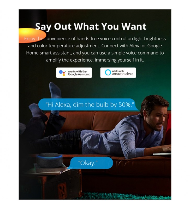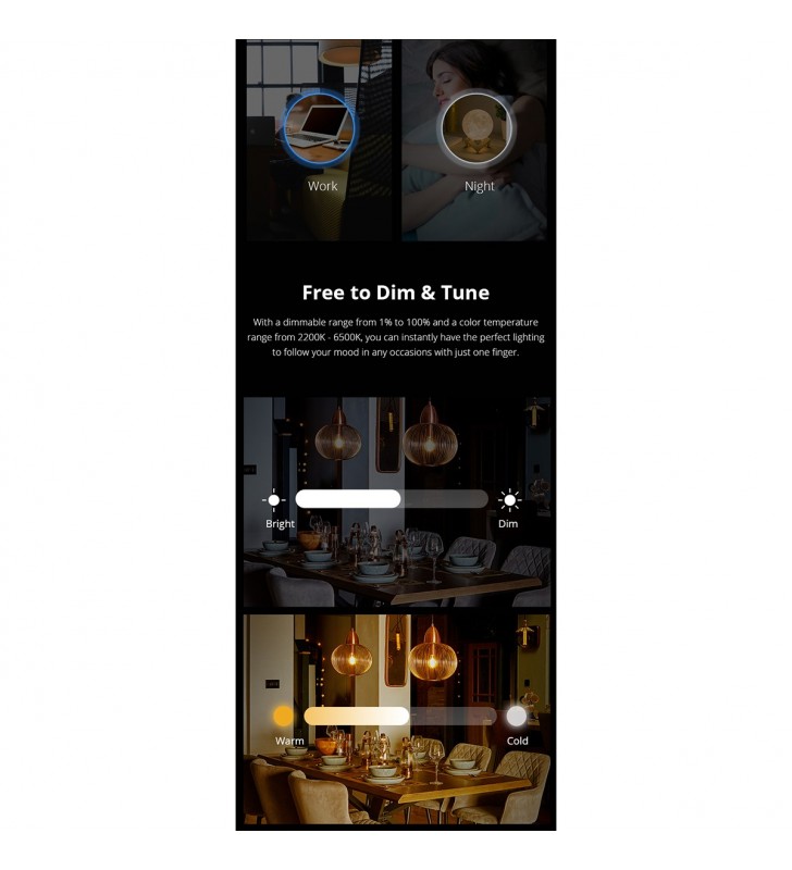 With B02-F smart bulbs, you can do more than remotely turn on and off using your smartphone and via your voice (connect with Alexa or Google Home, SmartThings ), a typical feature that is automated schedule can make the bulb automatically turn on and off which helps save energy and reduce your monthly electricity bill. The bulb is dimmable that you can cool down or warm up it to set the mood you want in a room. Just by its design with 4 preset mode which simply selects the corresponding modes and you can get your desired atmosphere for your space. Group control is designed to help control the specific lighting of an or more areas, saving much time on running them respectively.