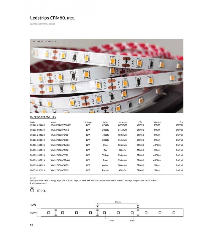 Ταινία Led SMD 2835, 12V, 5W/m, 712lm/m, 6000K, 5m/roll, CRI>80, IP20 - Vk Led (VK/12/3528/D/60)