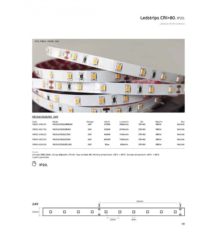 Ταινία Led SMD 2835, 24V, 5W/m, 80lm/m, BLUE, 5m/roll, CRI>80, IP20 - Vk Led (VK/24/3528/BL/60)