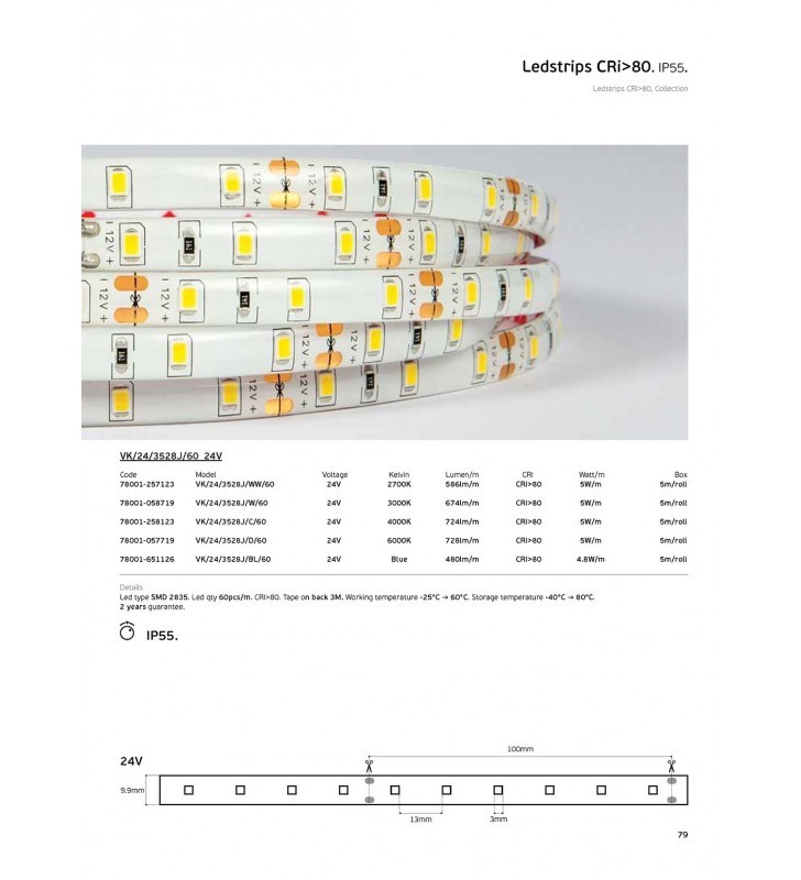 Ταινία Led SMD 2835, 24V, 5W/m, 674lm/m, 3000K, 5m/roll, CRI>80, IP55 - Vk Led (VK/24/3528J/W/60)